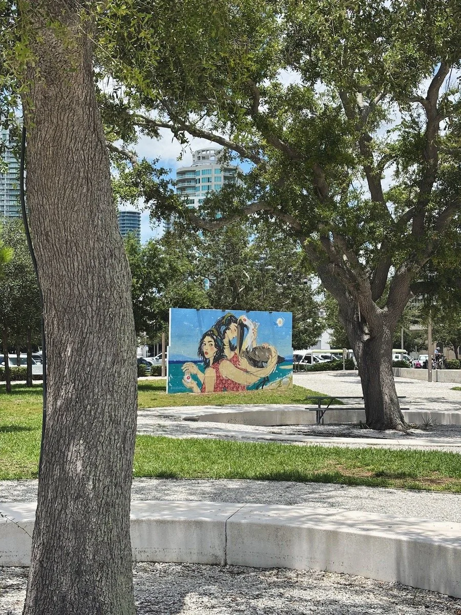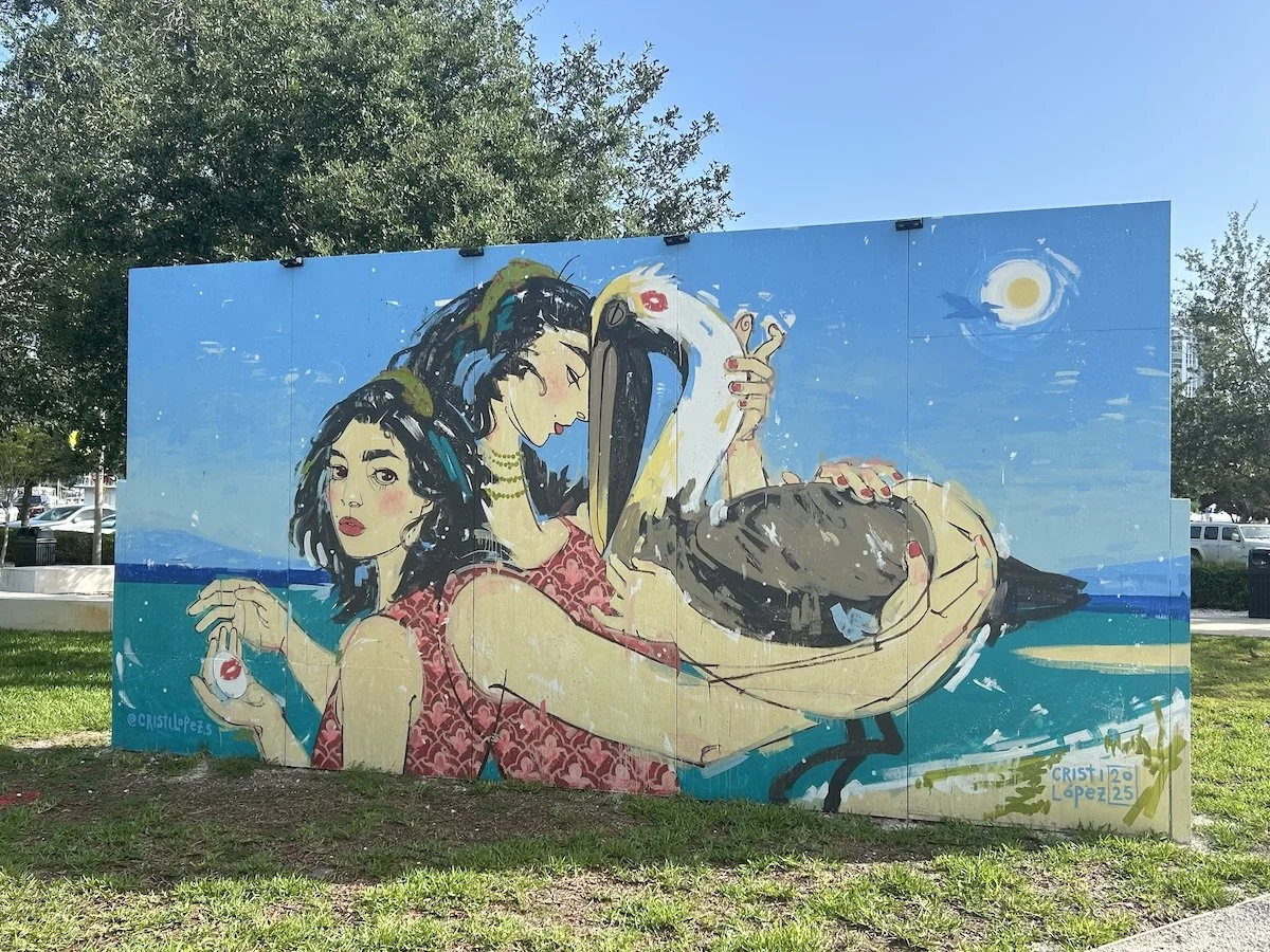 “Shared Shores” is temporary 20’ x 10’ mural created for the St. Pete Pier's 5th anniversary. This piece is a love letter to St. Pete's official city bird, the Brown Pelican. On the left side of the image, hands cradle a pelican egg adorned with a kiss, representative of the care we owe our precious Floridian fauna. In the center of the composition, our baby pelican has grown, embraced by the same figure that watched it hatch. On the right , we now see the pelican flying high, silhouetted against the blue skies of the bay. The human's care for the pelican is reciprocal, indicated by the fish adorning her hair. The Brown Pelican nearly went extinct in the late 20th century due to environmental contamination, but was brought back from the brink through environmental regulations and prioritization of tending to our natural world. The pelican is a symbol of resilience.